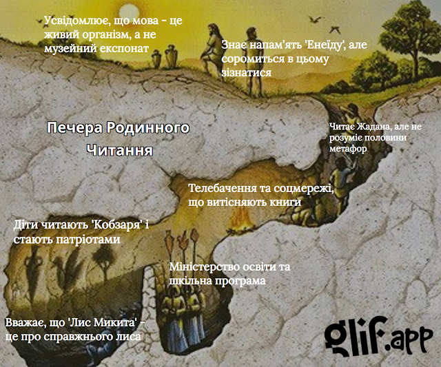 формат мему "Платонівська печера" заснований на відомій алегорії давньогрецького філософа Платона,